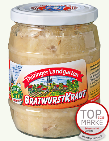 Ingredients: 92% Sauerkraut (white cabbage, salt), 3,0% brewed Thuringian Rostbratwurst dices (pork, water, salt, spices, stabilizer: diphosphate), 2,3% greaves lard (bacon, greaves), onions, starch, sugar, carrot dices, spices, antioxidant: ascorbic acid.- Size: 580 ml per jar