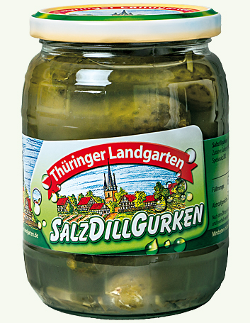 Lactic-acid fermented cucumbers in naturally cloudy infusion with fresh dill according to a traditional recipe of our family.