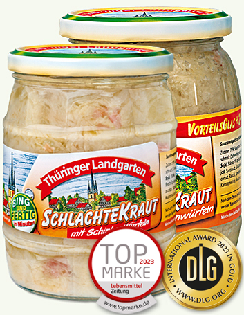 Mild sauerkraut from freshly harvested white cabbage refined with delicious greaves lard and smoked ham dices from Thuringia. Ready to eat!